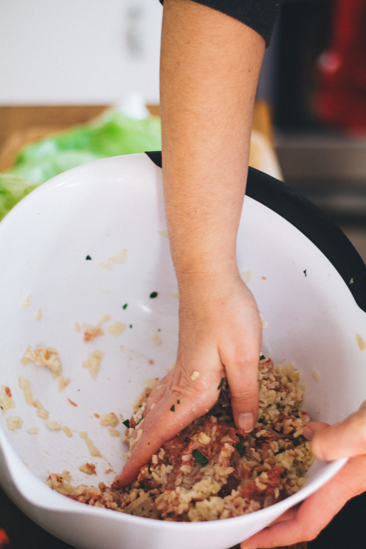 While my husband was out picking up some red wine for our meal, I searched cabbage on Pinterest and I finally decided on cabbage rolls. Perfect for a chilly day. No, I’m not Eastern European but I love anything stuffed with meat and cheese! I didn’t use one particular recipe, I just created my own based loosely on what I found on other peoples’ blogs. In my searching, I found a few different ways to make it, like with grated cauliflower instead of rice for the grain free types, and beans instead of ground beef for the vegetarians. I chose to fill my cabbage with grass fed beef and organic brown rice. I cooked the rice ahead of time but left the meat raw. I also sautéed half of an onion and chopped up some fresh parsley to mix in. I left out the egg some recipes were calling for and added some grated Parmesan cheese. Oh, and sorry, I am not the measuring type! After boiling the whole cabbage for ten minutes, I let it cool down before pulling the leaves off. I placed the filling on one side of a leaf and then wrapped it up like a burrito. I made 10 rolls with my mixture. I mixed a can of crushed tomatoes with some brown sugar to taste for the top. I baked covered for two hours at 325 degrees. When it came out, I let cool, topped with Parmesan cheese and devoured it with a nice glass of my favorite Cabernet.